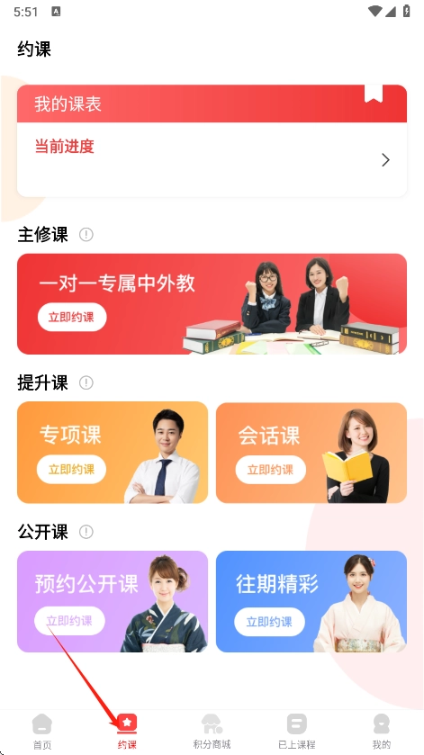 在约课板块中,你能够开展日语课程的学习,挑选出适合自己的课程。