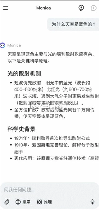 《Monica AI》是一款整合了众多主流语言模型的智能AI工具,用户能在其中灵活切换DeepSeek V3、R1等多个大模型,无论是日常生活场景还是学习场景都十分适用,无需具备专业知识就能轻松上手,为用户的生活增添更多便利,感兴趣的朋友不妨来体验一下吧!