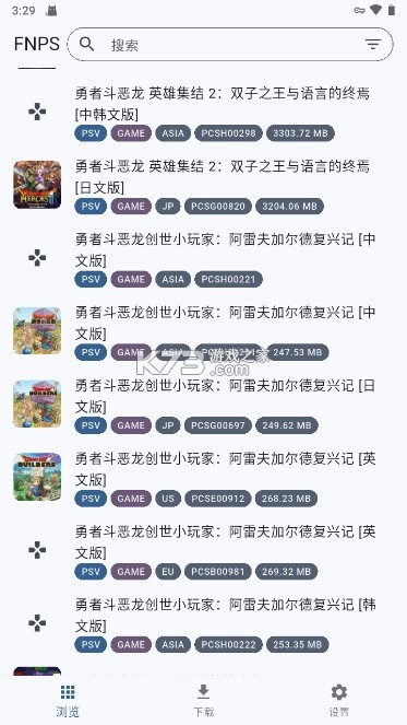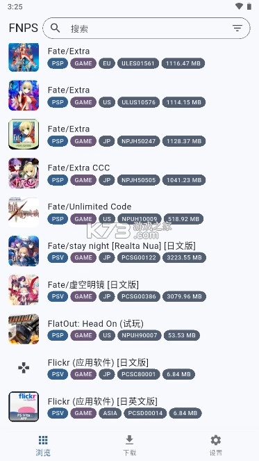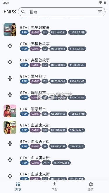 点击下方导航栏最左侧的“浏览”按钮后,即可查看远程列表中的游戏资源列表。该列表按英文字母顺序从上到下排列,且能直观显示游戏的机种平台、类型、区域及资源大小等信息。