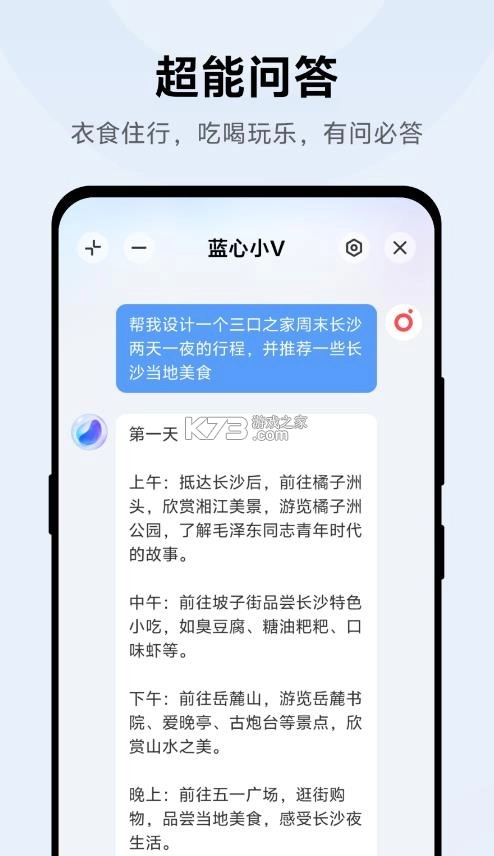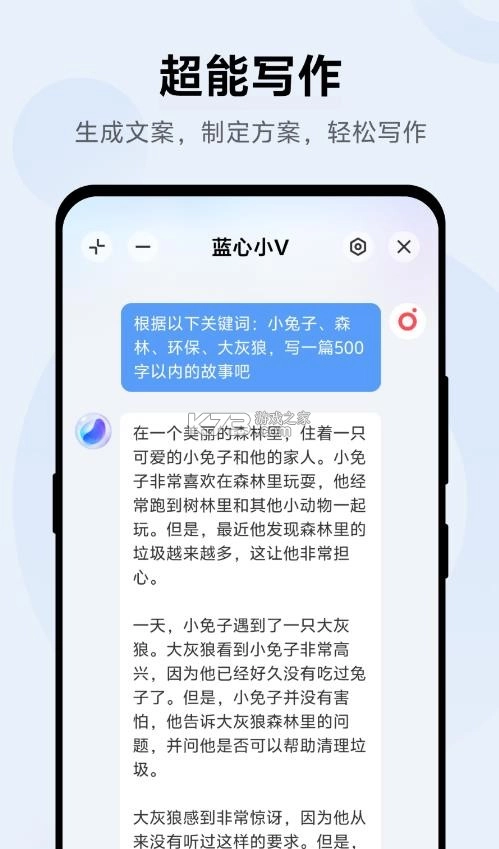 无论是语音输入还是文字输入,都能让你迅速得到准确的答案,帮你解开各类疑问。这里还有AI作图、文本生成等创作类功能,能为你激发灵感,让工作效率更上一层楼。同时支持语音、文字、拖拽三种交互方式,操作起来简单又方便,能满足不同场景下的使用需求。赶紧来体验「蓝心小V」,开启属于你的智能生活新篇章吧!