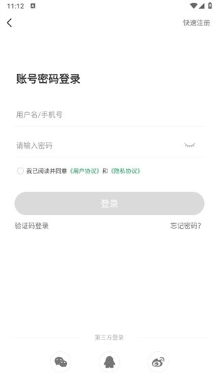 在完成点击操作后进入登录界面,能看到多种登录选项,包括账号密码登录、验证码登录,以及微信、QQ、微博等第三方登录方式。