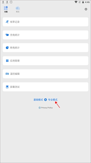 这里呈现了帧率记录、充电统计、耗电统计等功能,您可以点击下方红色箭头所指之处来重新挑选工作模式。