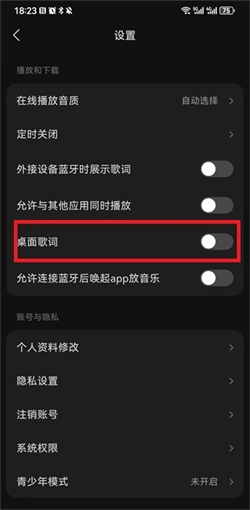 在设置功能里,我们能找到【桌面歌词】选项,点击打开按钮即可开启桌面歌词显示。