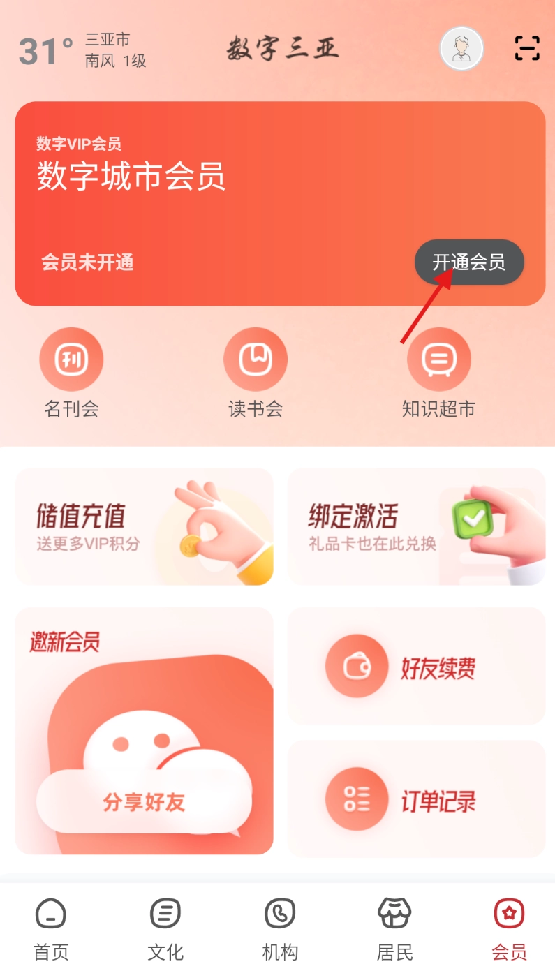 启动数字三亚应用后,在界面上方的导航区域找到并点击“会员”这一功能入口。