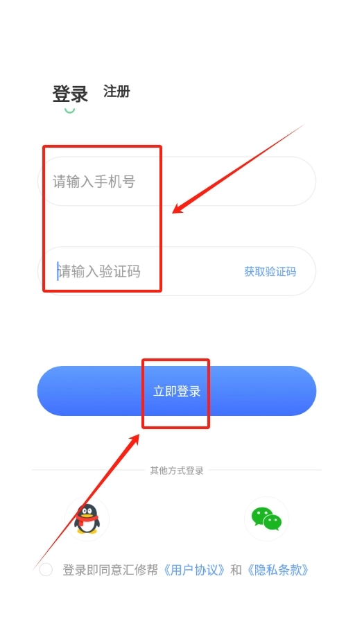 打开登录界面后,在指定的输入框中依次填写自己的手机号码以及获取到的验证码,这样就能顺利完成账号的登录操作了。