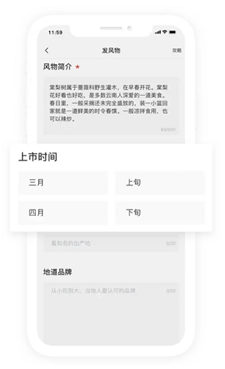 轻触首页底部的“+”按钮,随即进入内容发布页面,接着选择“发风物”选项,便可进入风物信息填写页面。
