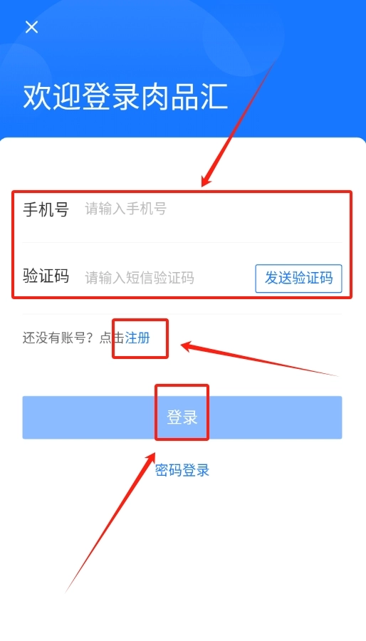 启动肉品汇应用后,若此前已完成账号注册,只需在登录界面输入绑定的手机号码,获取并填写验证码即可完成登录操作。