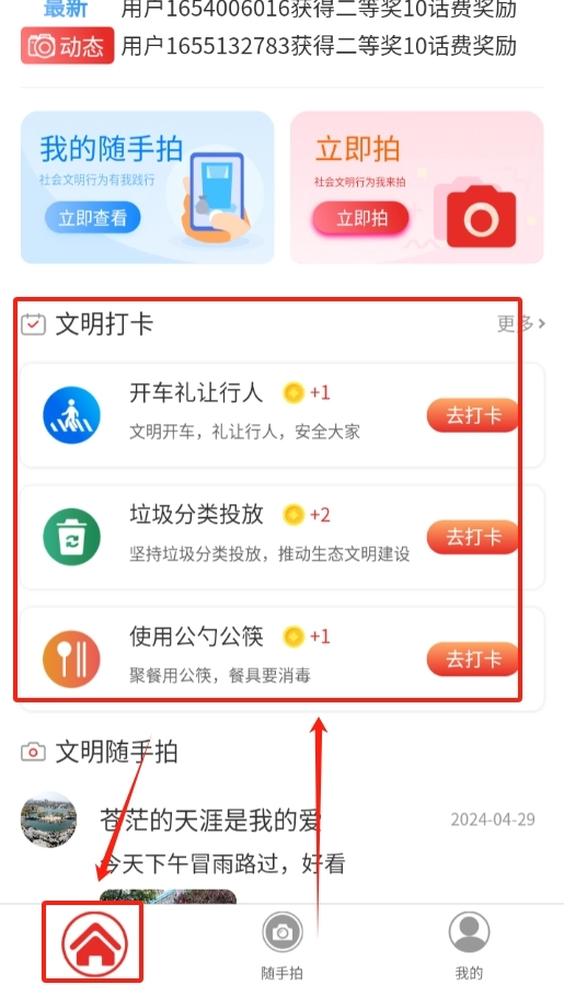 登录成功后会自动跳转回软件首页,在首页醒目的位置找到“文明打卡”按钮,点击该按钮即可参与打卡活动。