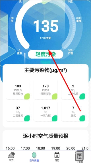 空气质量页面,能够显示当前空气质量状况,还可以提供逐小时、逐日的空气质量预报信息。