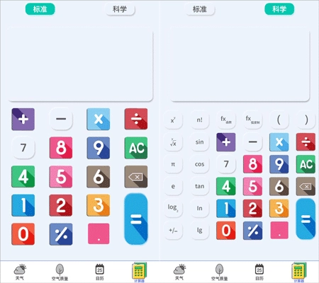 计算器界面设有标准与科学两种模式,能实现简单便捷的计算操作。
