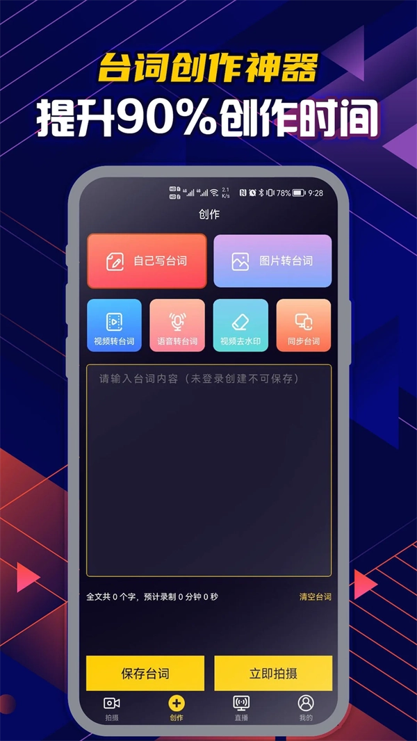 在创作页面选择【自己写台词】选项,输入内容后,可选择保存或者直接前往拍摄环节。