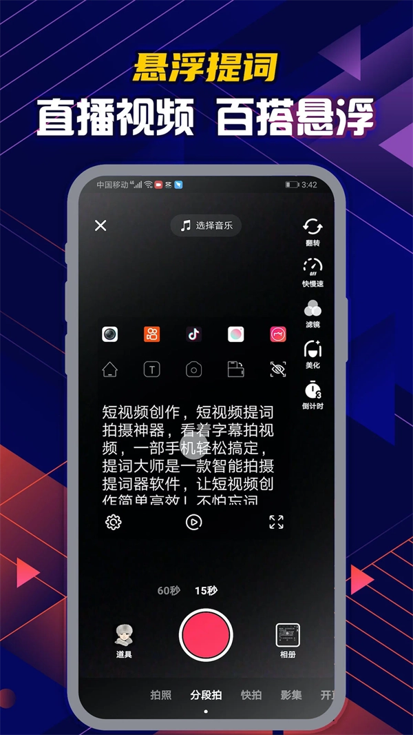 这款工具专为口播与直播场景设计,通过悬浮窗提词功能让内容表达更流畅;无需复杂设备即可自由切换虚拟背景,即便在普通环境下也能轻松完成高质量视频拍摄,是视频创作过程中的得力助手;深受主播群体青睐,无论是口播提词还是自拍短视频制作都能派上用场;能帮助用户在台词创作与拍摄环节节省大量时间,效率提升显著;助力vlog创作者更精准地呈现内容,逐步成长为台词表达的行家。