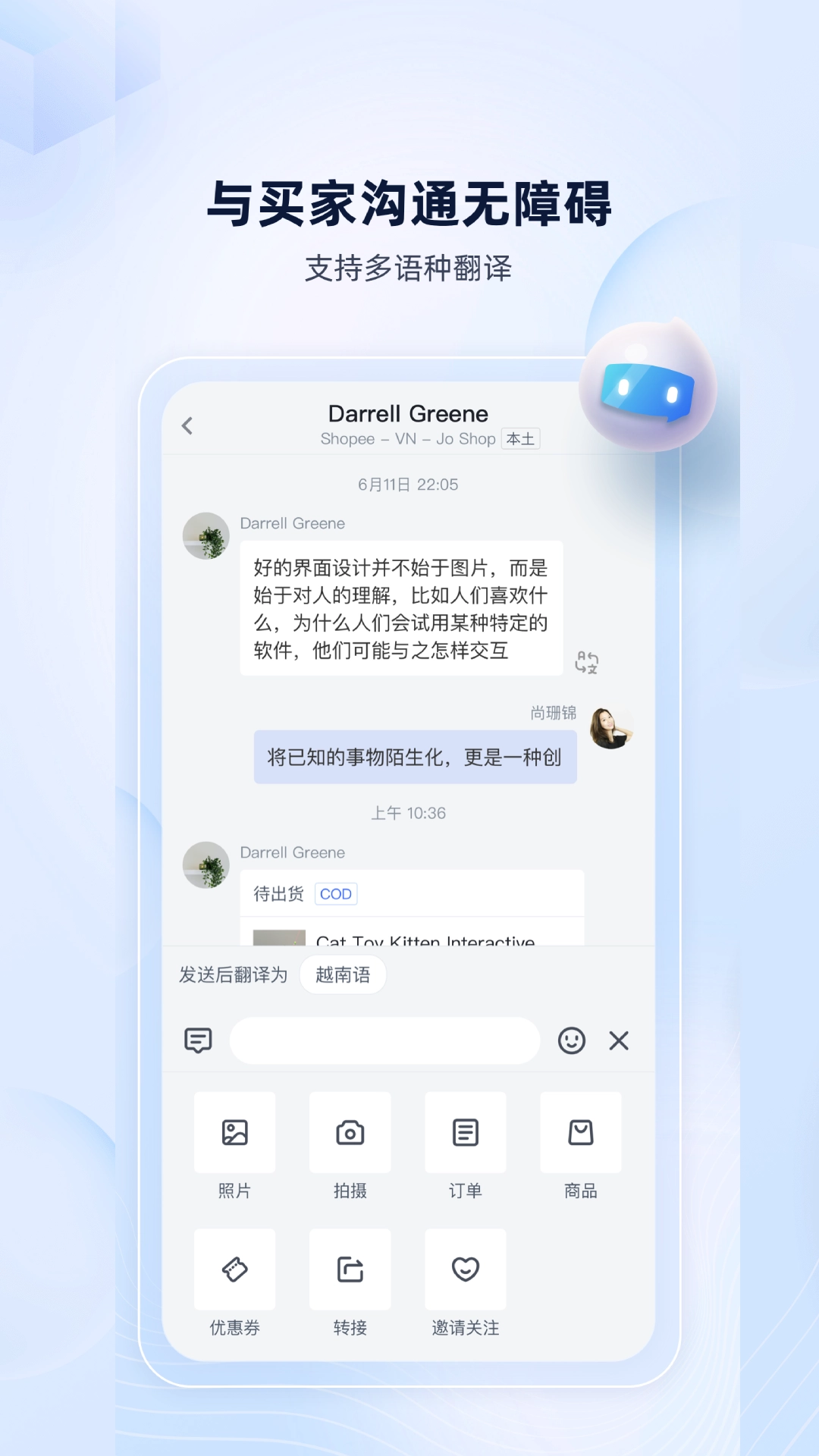 沟通界面了多语言互译功能,还能便捷分享订单详情、商品链接、优惠凭证等相关内容,让交流全程顺畅无阻。