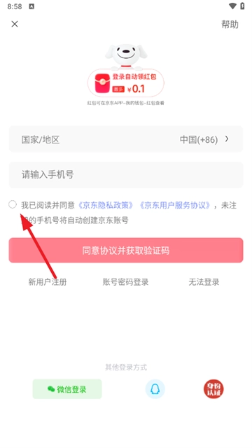您可以输入手机号并填写验证码完成登录,也能选择通过微信快捷登录,不过要记得勾选用户协议哦。