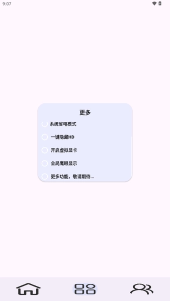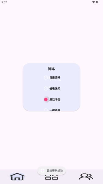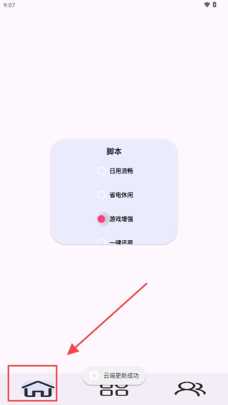 点击下方栏目的小房子图标后,可在脚本功能里自主挑选日用流畅、省电休闲、游戏增强、一键还原等不同模式。