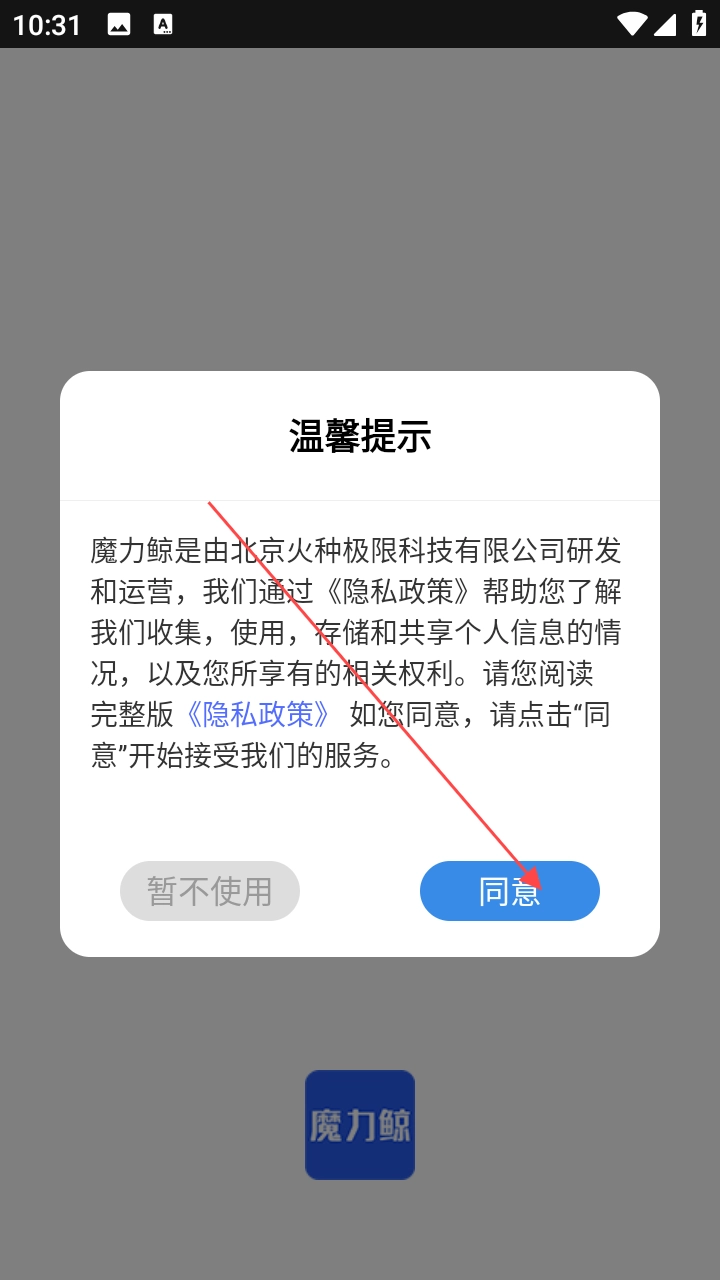 1. 初次开启魔力鲸,读完温馨提示后,点击【同意】。