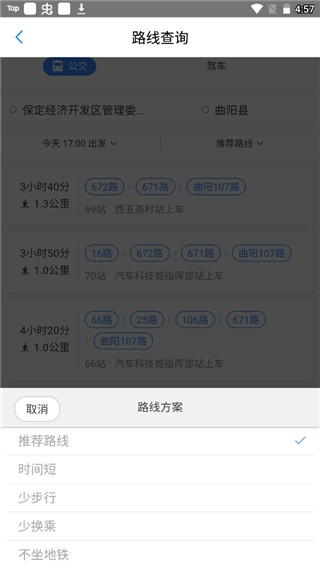 5、当用户点击推荐路线时,系统会依据不同需求,为用户提供诸如按时间段规划、少步行以及少换乘等各类推荐路线。
