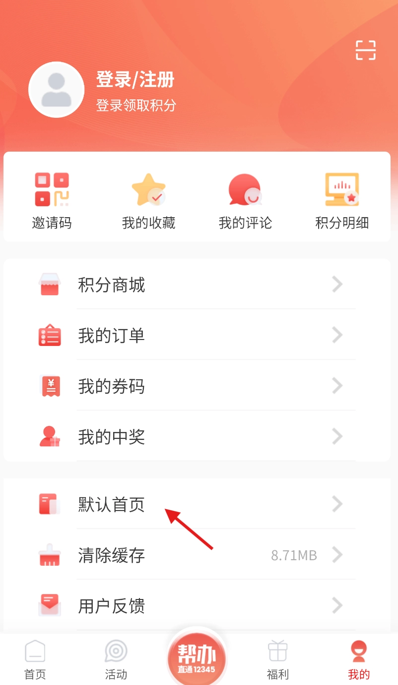 2、在个人设置页面里,寻找到“默认首页”设置选项,点击后进入首页模式选择界面。
