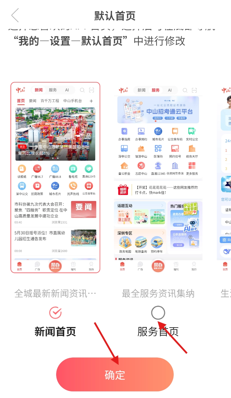 3、进入首页模式选择界面,点击选中“服务首页”,确认所选内容后,点击确定按钮,即可完成页面切换。