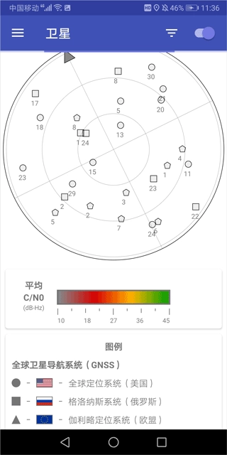5、接下来,用户便能在圆盘上仅看到中国北斗卫星,以及这些卫星信号的强度。