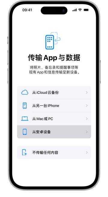 找到“传输App与数据”的屏幕,接着轻点“从安卓设备”选项。要是你已经完成了设置,那就得抹掉iOS设备后重新开始;要是你不想抹掉iOS设备,也可以手动转移内容。