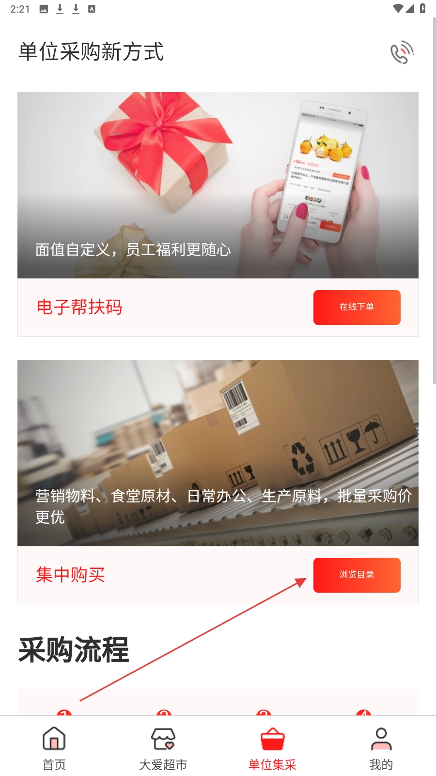 2. 在【单位集采】页面,点击【集中购买】旁边的【浏览目录】,以查看可采购的商品。