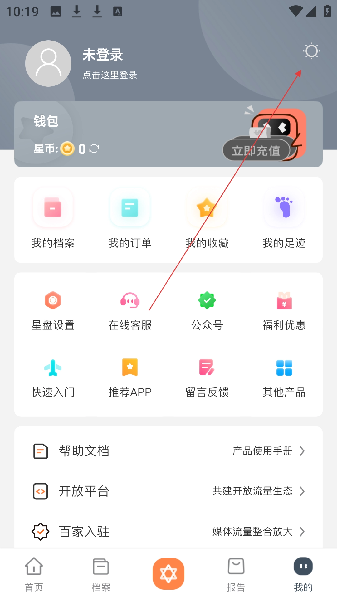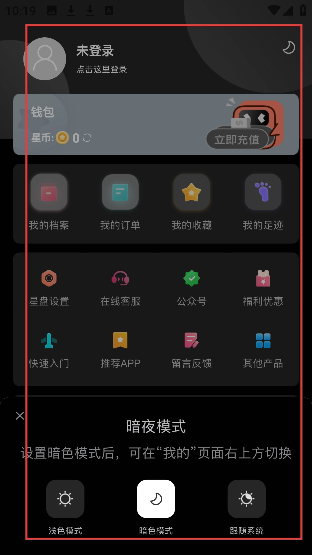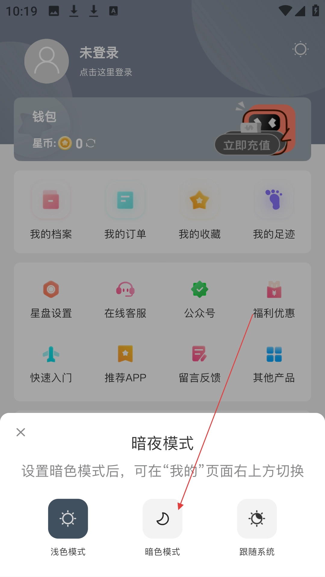 2. 在“我的”页面,点击右上角的【月亮图标】,即可开启模式选择。