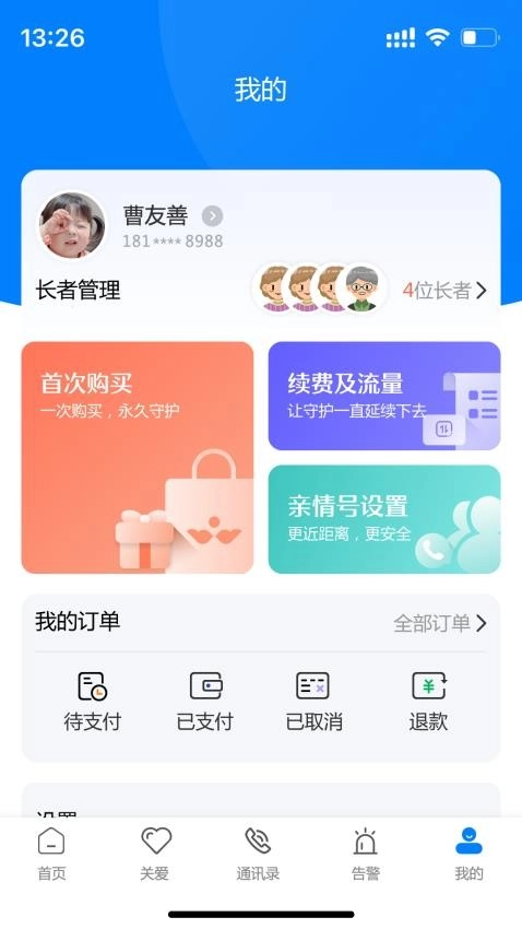 用户可通过手机号完成注册登录操作,进而使用颐养天使服务。