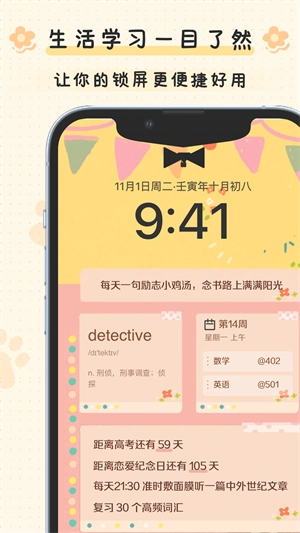 能自动每日更新的多场景锁屏壁纸,还支持在锁屏界面学习四六级与考研英语单词,让你随时随地都能记单词;