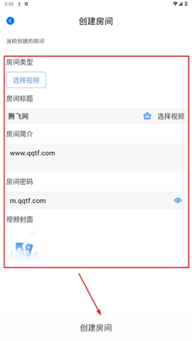 在房间创建页面,“选择视频”功能用于选定计划共同观看的动漫内容,房间的描述信息和访问密码可依据个人偏好进行自定义,所有设置确认无误后,再次点击“创建房间”按钮即可完成操作。