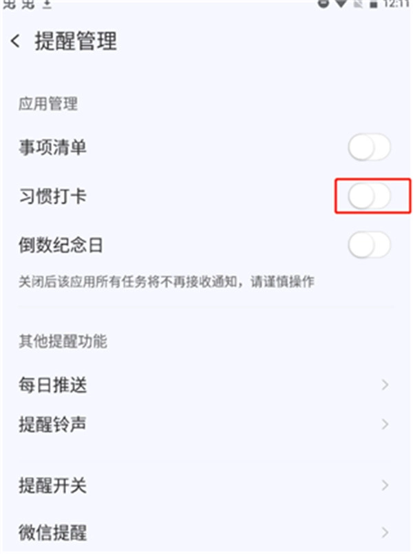 在提醒管理设置界面里,点击“习惯打卡”开关。