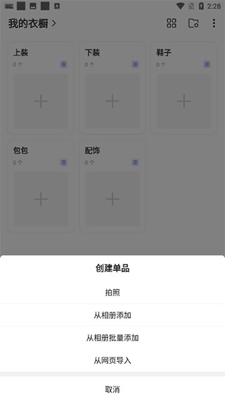 2、用户可选择以拍照、从相册上传添加、从网页导入等多种方式来创建单品。