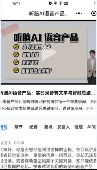 针对音视频内容的处理既精准又高效,不管是线上会议场景,还是远程交流讨论,都能迅速生成条理清晰的文字版本。