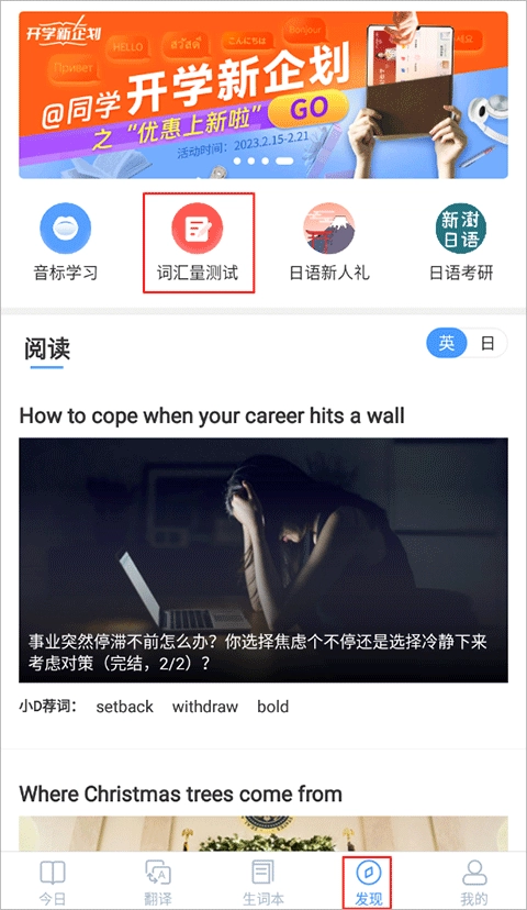 进入“发现”界面,点击“词汇量测试”选项。