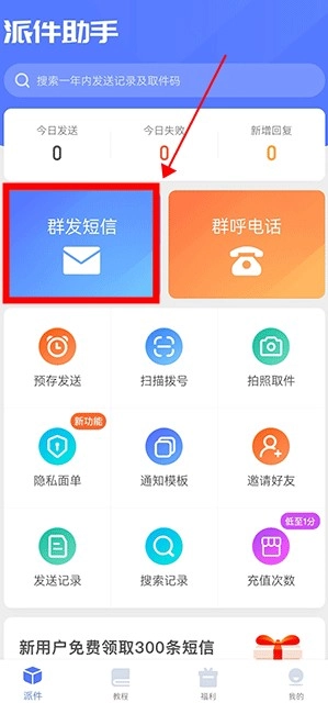 打开派件助手,进入首页并点击“群发短信”选项。