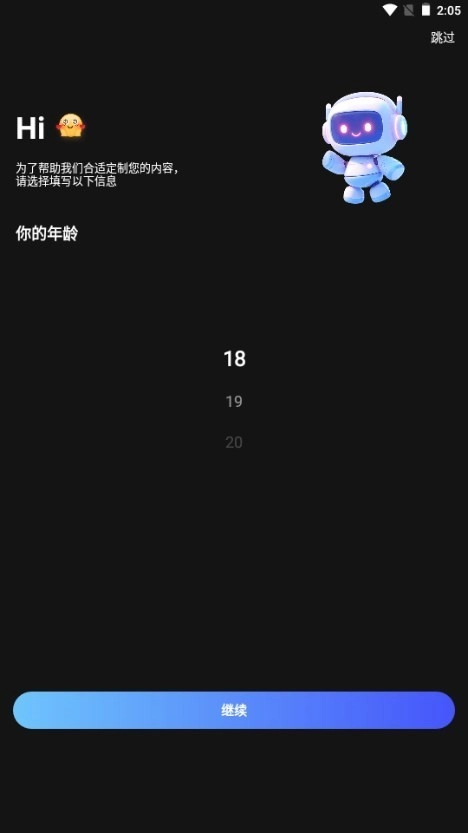 请输入年龄信息,若您不想填写,也可以点击右上角的按钮快速跳过。