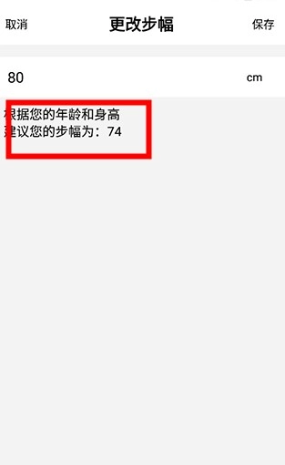 在健身设置界面中,找到当前已设定的步幅数值(比如74厘米),点击该数值后,结合自身的年龄与身高情况对步幅进行调整,完成调整后点击保存按钮就可以了。