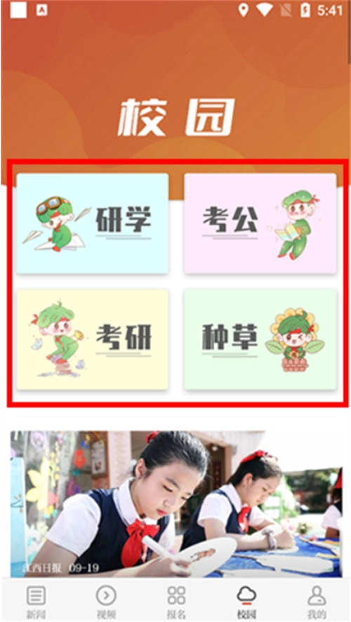 点击第四个按钮进入校园栏目后,用户就能选择不同的学习资讯了。