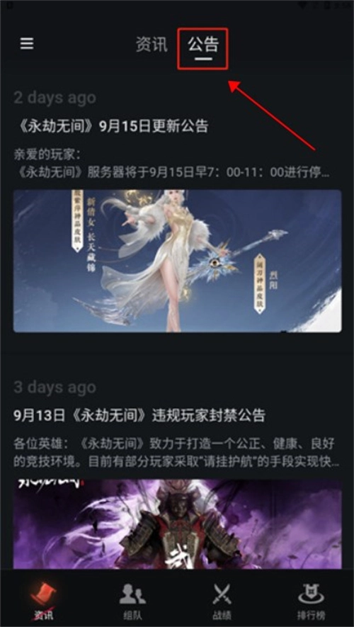 用户可借助公告功能了解《永劫无间》的最新游戏资讯。