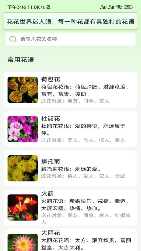 诸多常用花语内容,每一种化都有其独特的花语,可在应用中全面阅览了解;