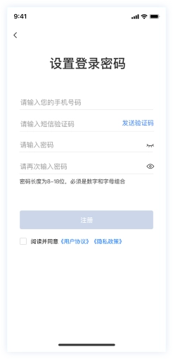 设置并确认登录密码,勾选用户协议与隐私协议,完成账号注册流程。