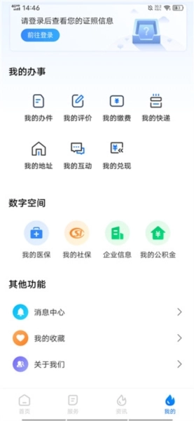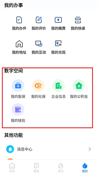 登录账户后,向下滑动页面,在下方的数字空间板块里点击对应的选项,就能快速查询医保、社保、公积金等信息的详情。