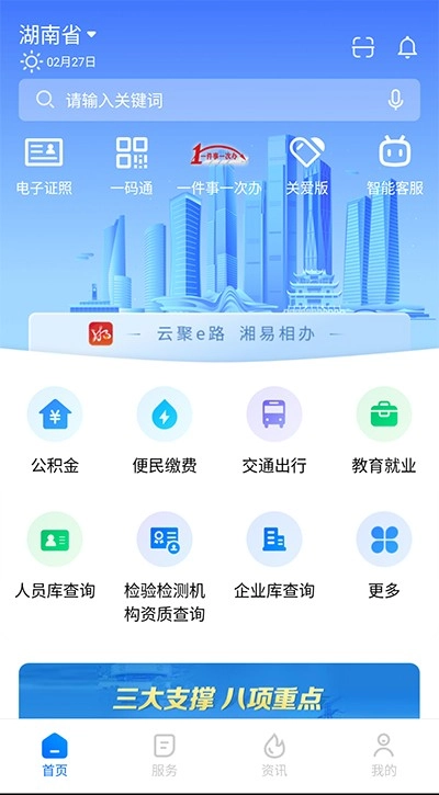 湘易办是专门面向湖南省用户的线上政务服务平台,集成了多元化服务功能,支持用户在线查询公积金、水电费、社保等信息,同时涵盖交通出行、教育就业等领域的服务内容。平台还为企业构建了线上事务处理专区,助力企业高效完成各类事项办理。作为“一站式”掌上办事总入口,湘易办整合多项功能,企业和群众通过这一平台即可享受智能、便捷、优质的政务服务,同时满足公务人员办文、办会、办事的数字化需求。此次推出的公众版,主要服务普通群众与市场主体,设有“首页、服务、资讯、我的”四大板块,汇聚全省50个省直单位、14个市州及湘江新区的政务服务与生活服务超5000项,电子证照达53类。