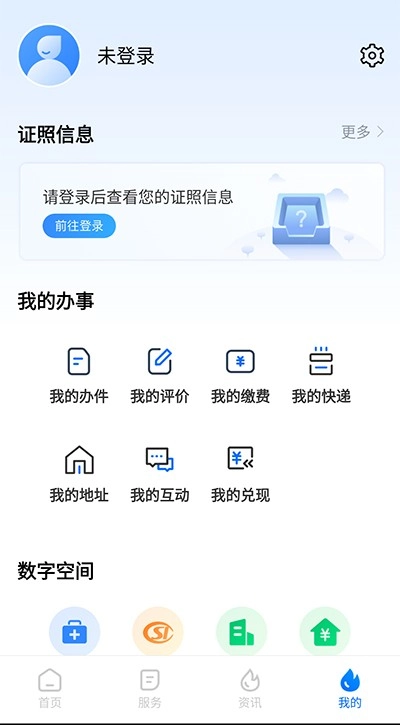 “我的”版块设有个人/企业信息、证照信息、我的办事、数字空间等栏目,可实现办件实时跟踪、服务全过程留痕、电子资料随心存储等智能化数字化功能。