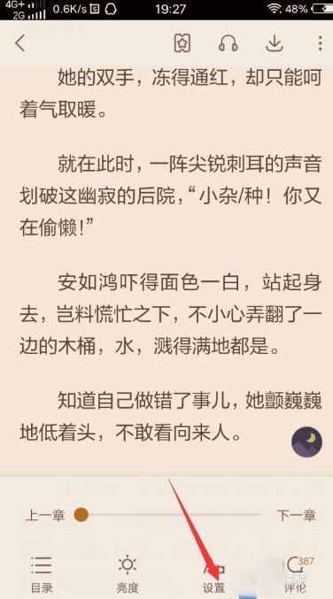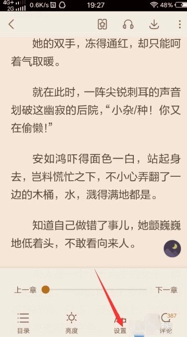 第一步,打开你所使用的小说阅读软件。接着,依据自身手机型号,找到并点击进入小说功能设置的初始界面,参考下图所示。随后,点击界面中的“设置”选项。