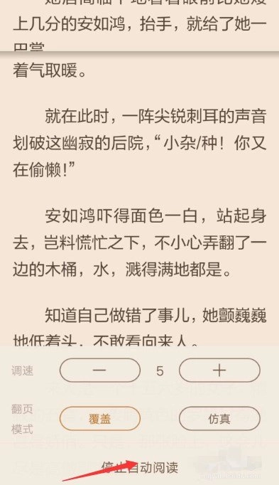 点击自动翻页后,便进入自动翻页设置状态,其中涵盖调试与翻页模式。调速可通过中间数字两侧的“+”“-”符号进行调节。若想增加数字,点击“+”号,这样意味着能有更长的阅读时间,随后小说的页数便会自动翻页。