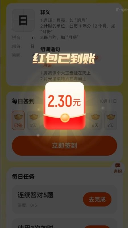 计步零钱宝能让用户在趣味中学习汉字,不仅可以查看汉字的详细释义解析,轻松掌握相关汉字、了解更多汉字知识,还提供多种挑战模式供自由选择,通过趣味汉字挑战游戏答对题目赢取红包,赚取红包收益,从而轻松获得零花钱,增加收入来源。