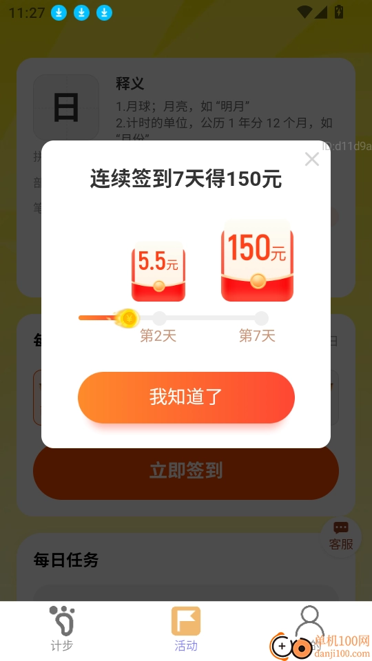 之后就会弹出签到的提示窗口,点击“我知道了”按钮就能完成签到。