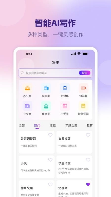 能为你提供智能的AI写作服务,让你以后写文案更轻松,轻松搞定各类文案内容。