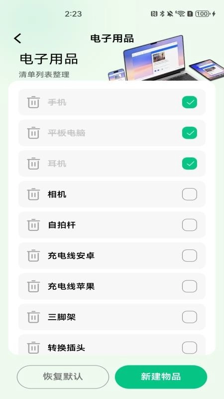 展示了关于用户详细的出发清单,就可让你随时新建物品,更好的整理自己的出发清单。
